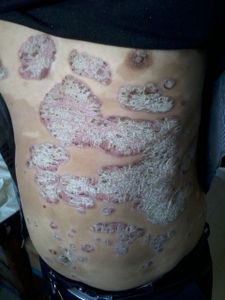 1)牛皮癣的四诊与辨证。通常牛皮癣医生诊病时先看皮损,而火神扶阳灭癣疗法则应先注意患者整体状况,如面色、形体、精神、言语、情绪等,对其属实、属虚、属郁等的大致情况心中有数,并询问饮食、睡眠、月经、二便、有无其他疾病等,再看皮损及察舌按脉,局部与整体结合辨证,得出完善和正确的辨证结论。